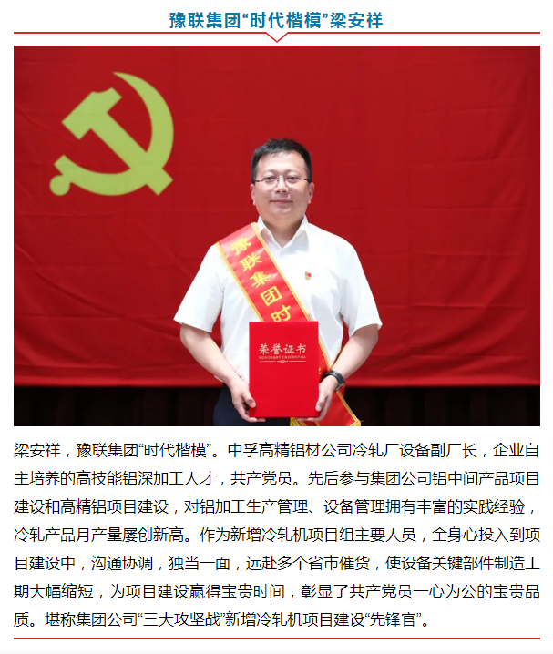 從進入企業(yè)起,梁安祥就決心在這個夢想開始的地方干出一番事業(yè)來。2007年,梁安祥被公司選派到羅馬尼亞進行鋁加工技術學習培訓,2008年結業(yè)回來后立即投入公司鋁中間產品項目建設,完成了美國、意大利等國進口設備生產線及附屬設備的土建施工和設備安裝監(jiān)督檢驗工作。2010年5月調入擴建指揮部,先后參與了“1+4”熱連軋機組、單機架和雙機架冷軋機組、切邊機組等設備的技術交流、標書編寫、工程進度和質量跟蹤等工作??吹礁呔X項目建成投產,他心潮澎湃、激動萬分。