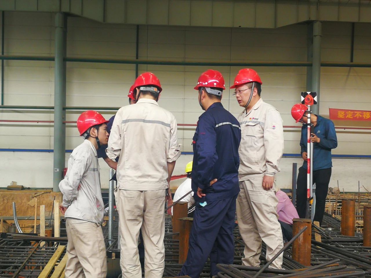 梁安祥(右二)與安裝單位共同核驗新增冷軋機地腳螺栓定位尺寸