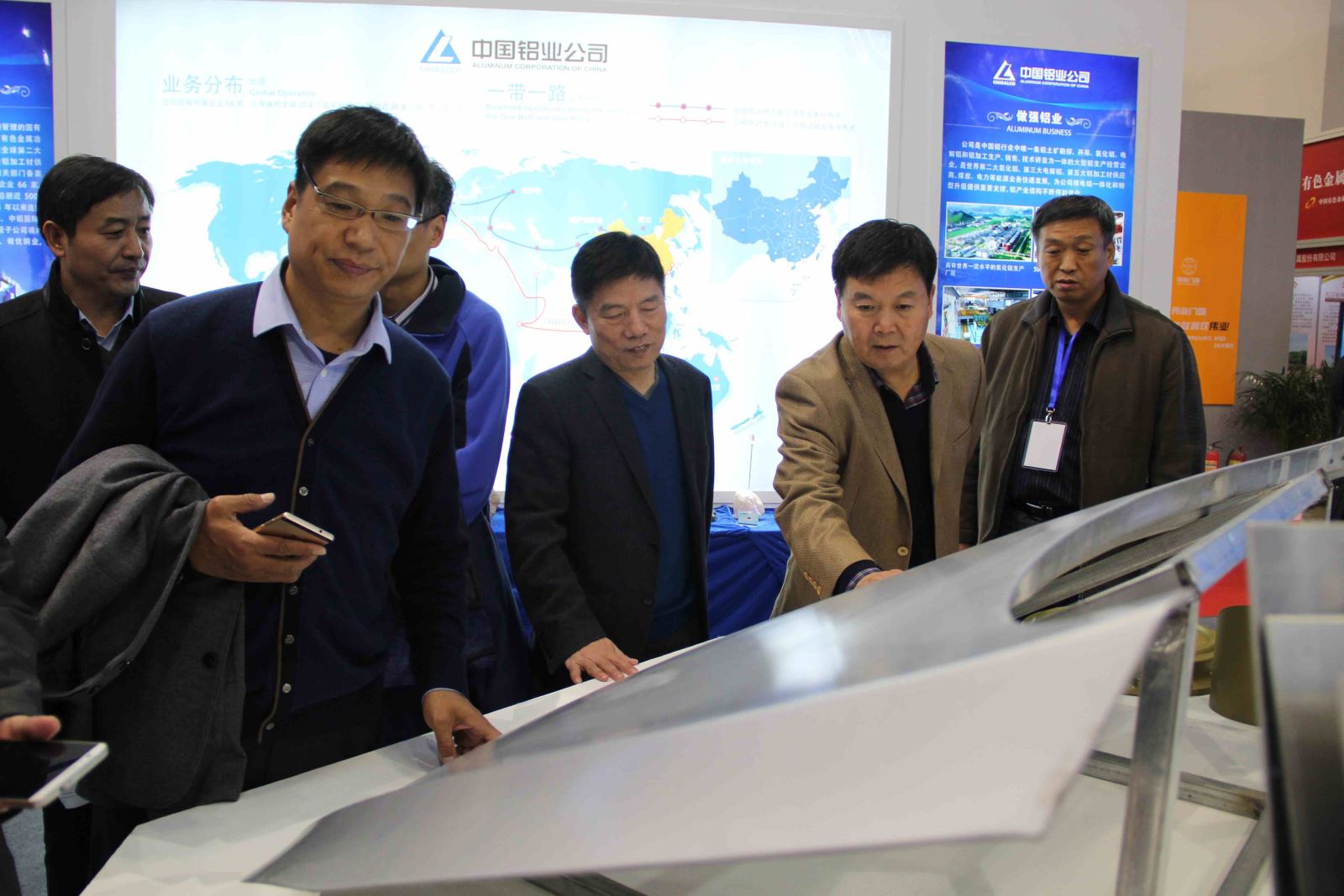11月14日下午,賀懷欽董事長親自帶隊,集團公司領(lǐng)導班子利用短短兩個小時的時間,先后詳細參觀了有色金屬工業(yè)成就展的各個展區(qū)、展臺。偌大展廳內(nèi),各個展臺陳列著有色金屬新材料和鋁加工產(chǎn)品,包括大飛機及船舶用鋁合金蒙皮、輕軌高鐵、飛機起落架、易拉罐罐體、罐蓋及拉環(huán)、汽車前機蓋、卡車油箱踏板、手機后殼及電池蓋、電腦后蓋及內(nèi)構(gòu)板、鋰離子電池用鋁合金板、食品包裝、自行車等多種鋁合金制造產(chǎn)品,可謂琳瑯滿目,美不勝收,預示著鋁精深加工消費市場未來廣闊的應(yīng)用前景。每到一處,賀懷欽董事長和領(lǐng)導班子一起,邊參觀邊詢問,從產(chǎn)品外觀到材質(zhì)、從應(yīng)用到市場占有份額,尤其對每種產(chǎn)品的未來市場前景都一一細致入微地調(diào)研詢問,并饒有興致地不時拿起鋁合金加工產(chǎn)品進行仔細觀察。公司領(lǐng)導班子成員邊走邊看,邊思考邊交流,開放共享、充滿創(chuàng)新元素的成果展讓公司核心層有了很大的收獲。