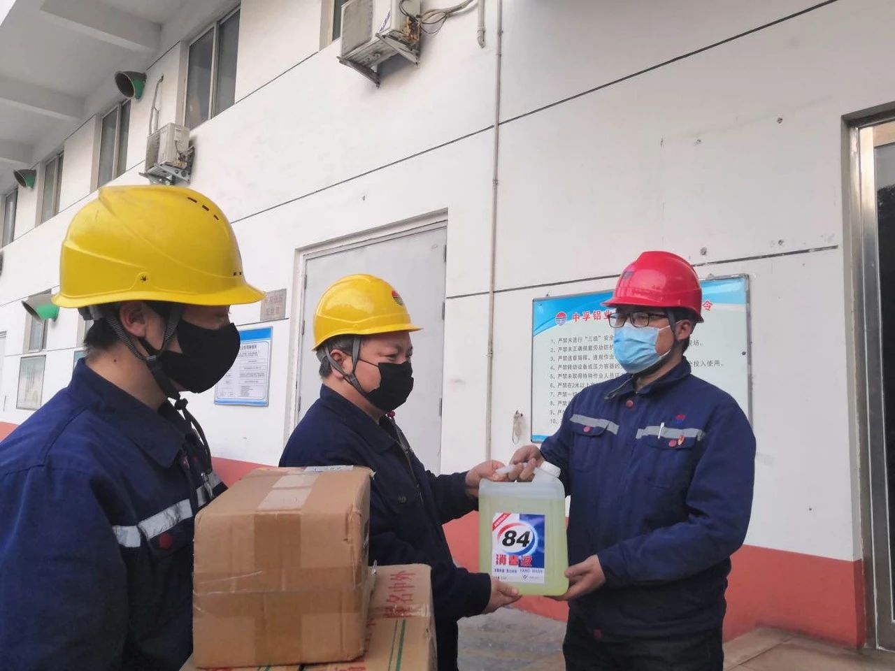 趙聰峰(右)給員工發(fā)放消毒液
