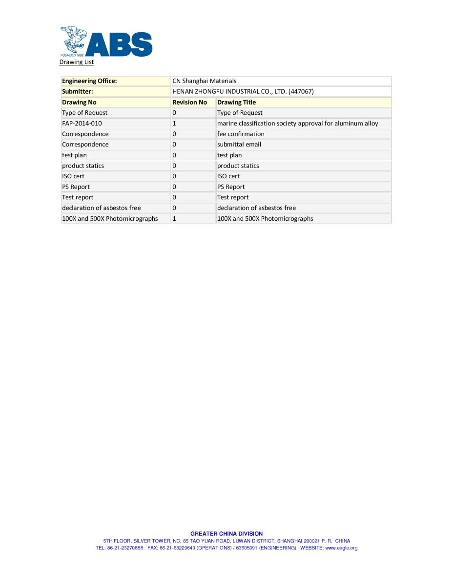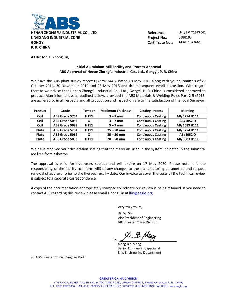 繼之前通過ISO/TS16949汽車板認證和英國船級社(LR)認證之后,近日,中孚高精鋁公司生產(chǎn)的5083、5754、5052合金卷材和板材產(chǎn)品順利通過美國船級社(ABS)認證,相關(guān)信息已在美國船級社官網(wǎng)公布。