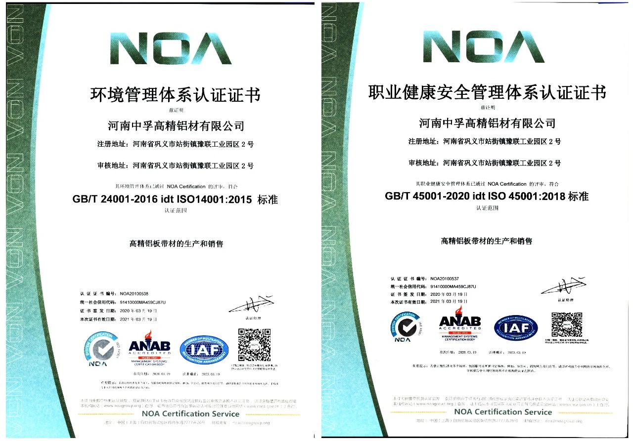 中孚高精鋁材公司獲得環(huán)境/職業(yè)健康安全管理體系認(rèn)證證書(shū)